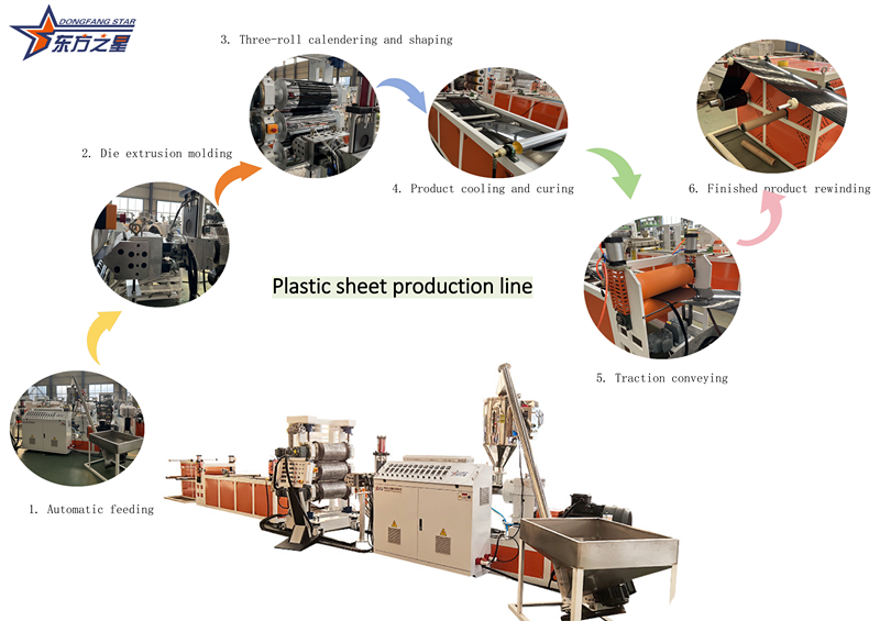कैलेंडर और शीतलन: शीट को तीन-रोल कैलेंडर का उपयोग करके नियंत्रित तापमान के तहत ठंडा किया जाता है, समतल किया जाता है, और इसकी मोटाई और सतह की फिनिश निर्धारित की जाती है।
